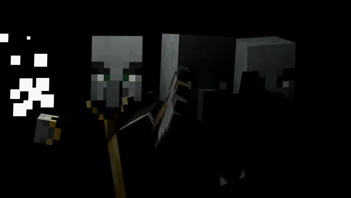 This is her phase when she's first spawned. She has Warden-like hearing and will attack zombies, illagers, and players that she hears and spots.