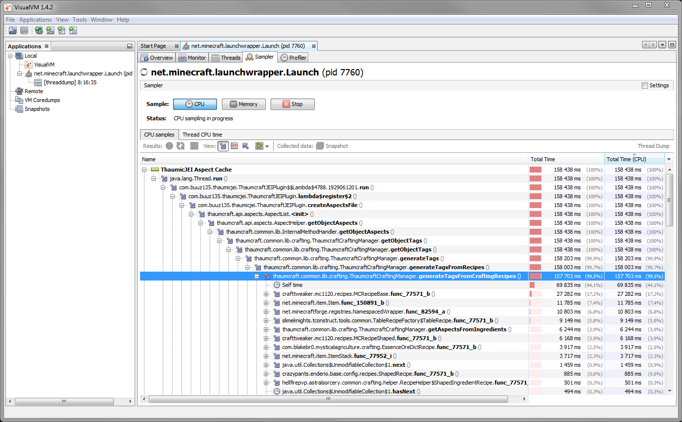 I was having trouble with lag while playing All The Mods 3 mod pack so I ran VisualVM to see what was causing it. It appears ThaumicJEI Aspect Cache is eating up insane amounts of CPU time and memory.