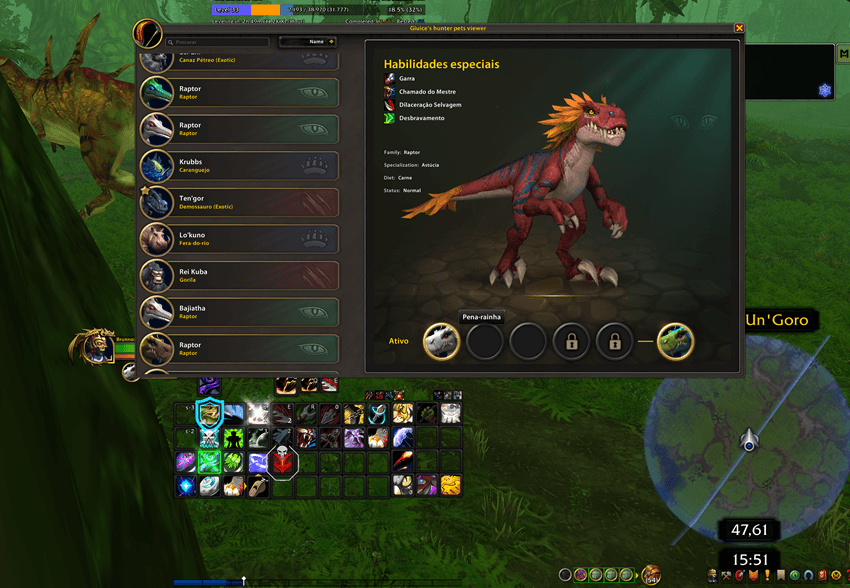 - Displays a list of all hunter pets with their name, level, abilities, foods, and active status.