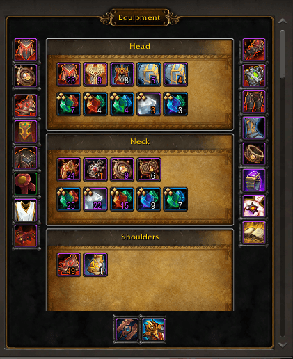 - Your current equipment (shown on the left/right and bottom border) and top 5 BiS equipment. Used gems and applied enchancement are also shown. Coloring of the numbers refer to the best players or the next 4 best players equipment. By clicking on any slot of your equipment, list view will scroll immediately to that BiS equipment.