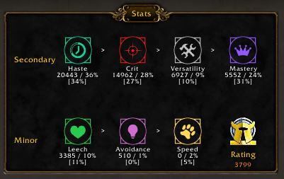 - Secondary and minor stats ordered by importance: values and percentages are avarage values of top 50 players. Percentages within the brackets are your stat values.