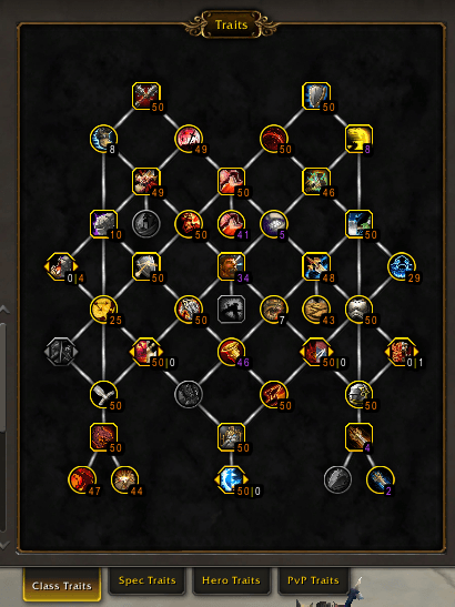 - Traits for class/specialization/hero and PvP. Coloring of the numbers refer to the best players or the next 4 best players traits. if you see multiple choice nodes 2 numbers are provided (left number for the left choice and right number for the right choice).
